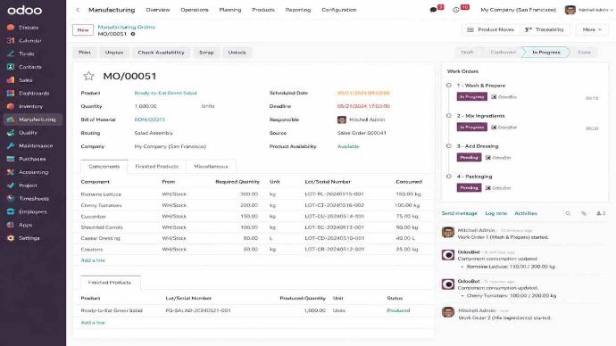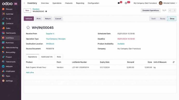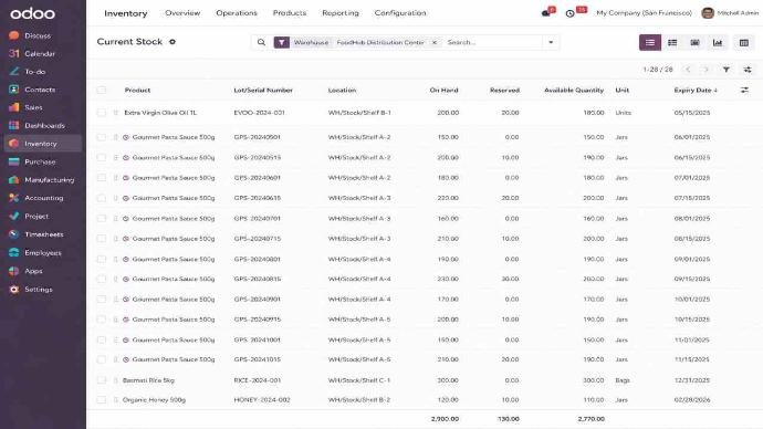 Every ingredient batch is logged with lot number, supplier certificate, and expiration date. Odoo automatically triggers alerts when expiry dates approach.